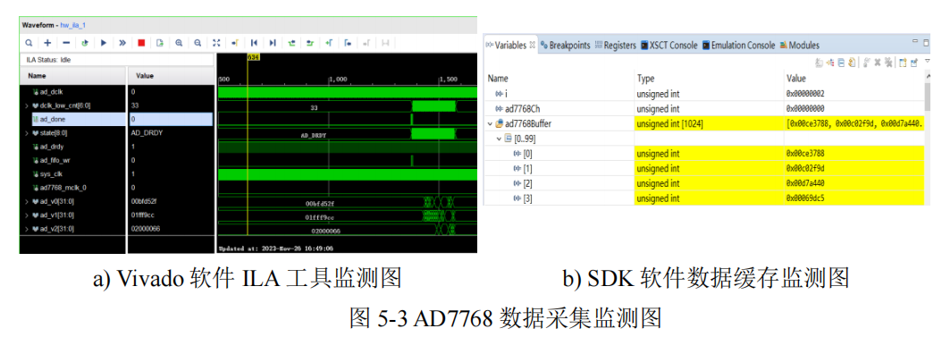 析仪(ILA)探针进行在线监测(如图 5-3 a)),并使用 SDK 软件监测 AD7768