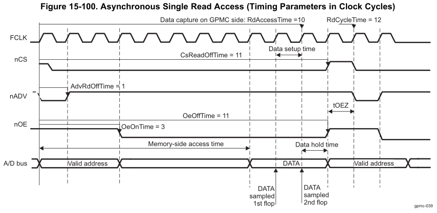即CS有效时间,OE有效时间,GPMC读取数据时间,GPMC单个读取周期。