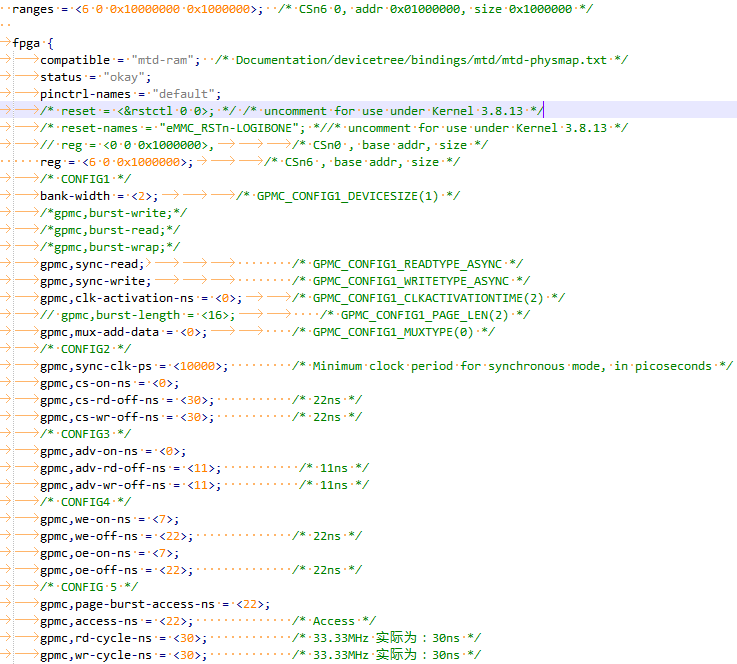 (3)最后在实现一个自己的GPMC设备节点,其中关键的时序参数如下,在这里我们设置GPMC的片选CS6地址为0x10000000,大小为16MB,GPMC的单个读取周期为30ns。