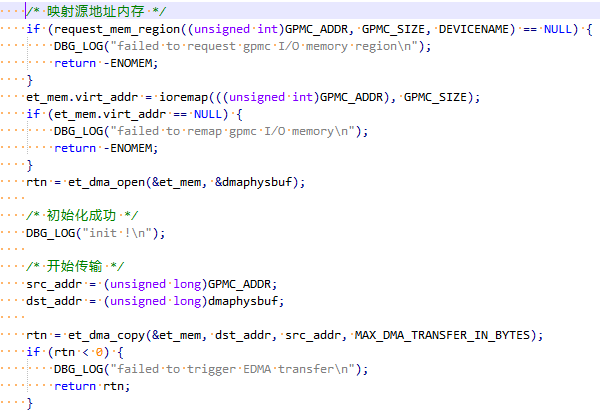 需要注意的是,DMA中配置的地址都为物理地址,即DMA传送到源端为外设的地址即GPMC的物理地址,目的地端为你申请的内存空间物理地址。