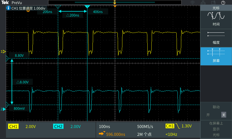 memread中使用mmap方法把GPMC的物理地址0x10000000映射到用户空间。在用户空间通过CPU读取GPMC端口数据,抓取CS6n和OEn的波形如下,目前没有用到DMA传送,只是在Linux循环读取,可以看见每个周期里片选信号CS6n都会维持很长一段高电平的时间,GPMC一次的读取周期大概为200ns。