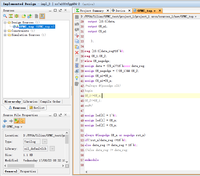 (3)FPGA端对应的代码,FPGA端的代码只要是实现在每个OEn信号下降沿来的时候,把16bit的数据送到GPMC_DATA端口,并自加一次。